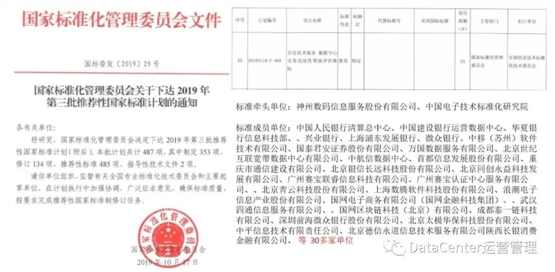 《数据中心业务连续性等级评价准则》于2016年启动立项准备工作,并于2017年正式上报国家标准提案。2019年《国家标准委关于下达2019年第三批国家标准制修订计划的通知》中,国家标准《数据中心业务连续性等级评价准则》获正式立项,标准计划号:20193178-T-469