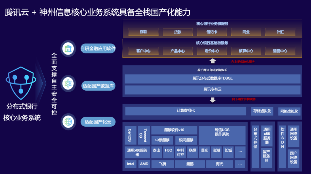 双方已携手落地广州农商行、浦发硅谷等银行的核心系统。此次,腾讯云联手神州信息发布的“金融分布式核心”联合解决方案,正是双方为满足银行业核心全栈式国产化需求交出的一份答卷。