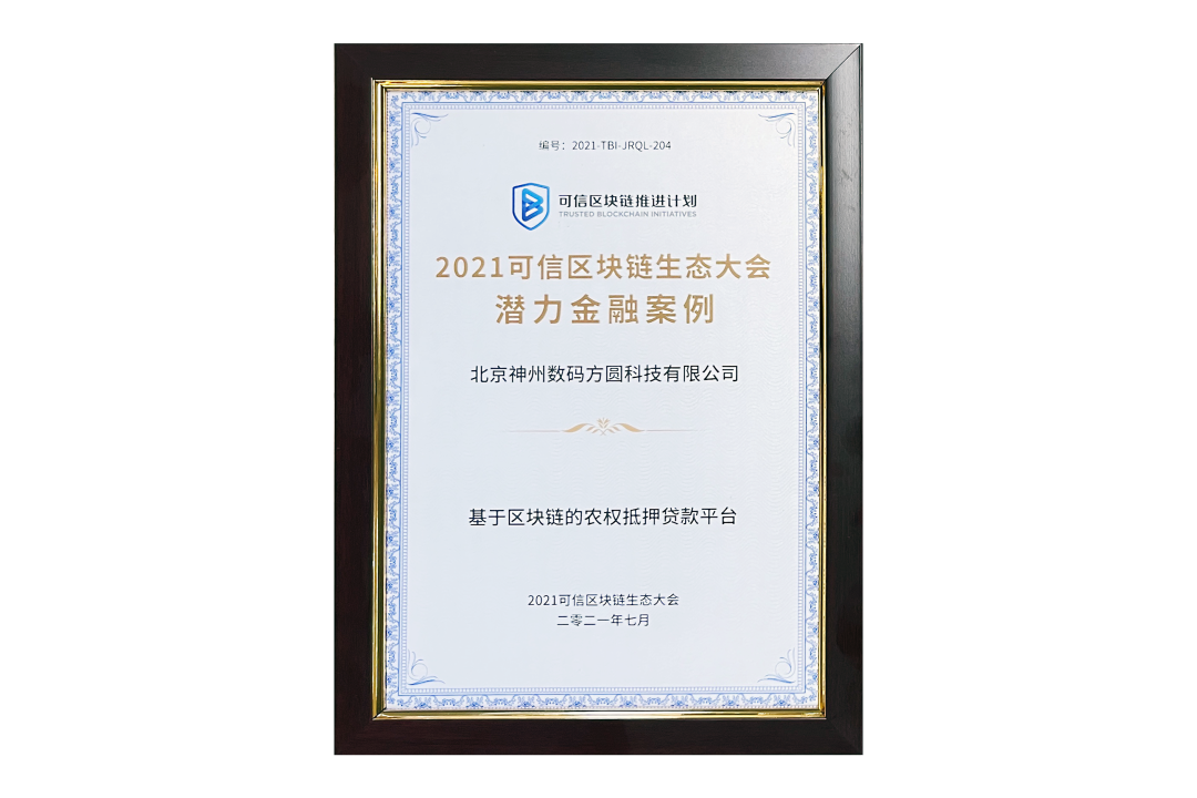 7月13日,由中国信息通信研究院、可信区块链推进计划主办的“2021可信区块链生态大会”在京举办,并隆重发布系列成果。神州信息子公司北京nangong28.com方圆科技有限公司(简称:神州方圆)推荐的“基于区块链的农权抵押贷款平台”荣获十大金融应用高潜力案例,为“区块链+农业”落地带来示范效应。