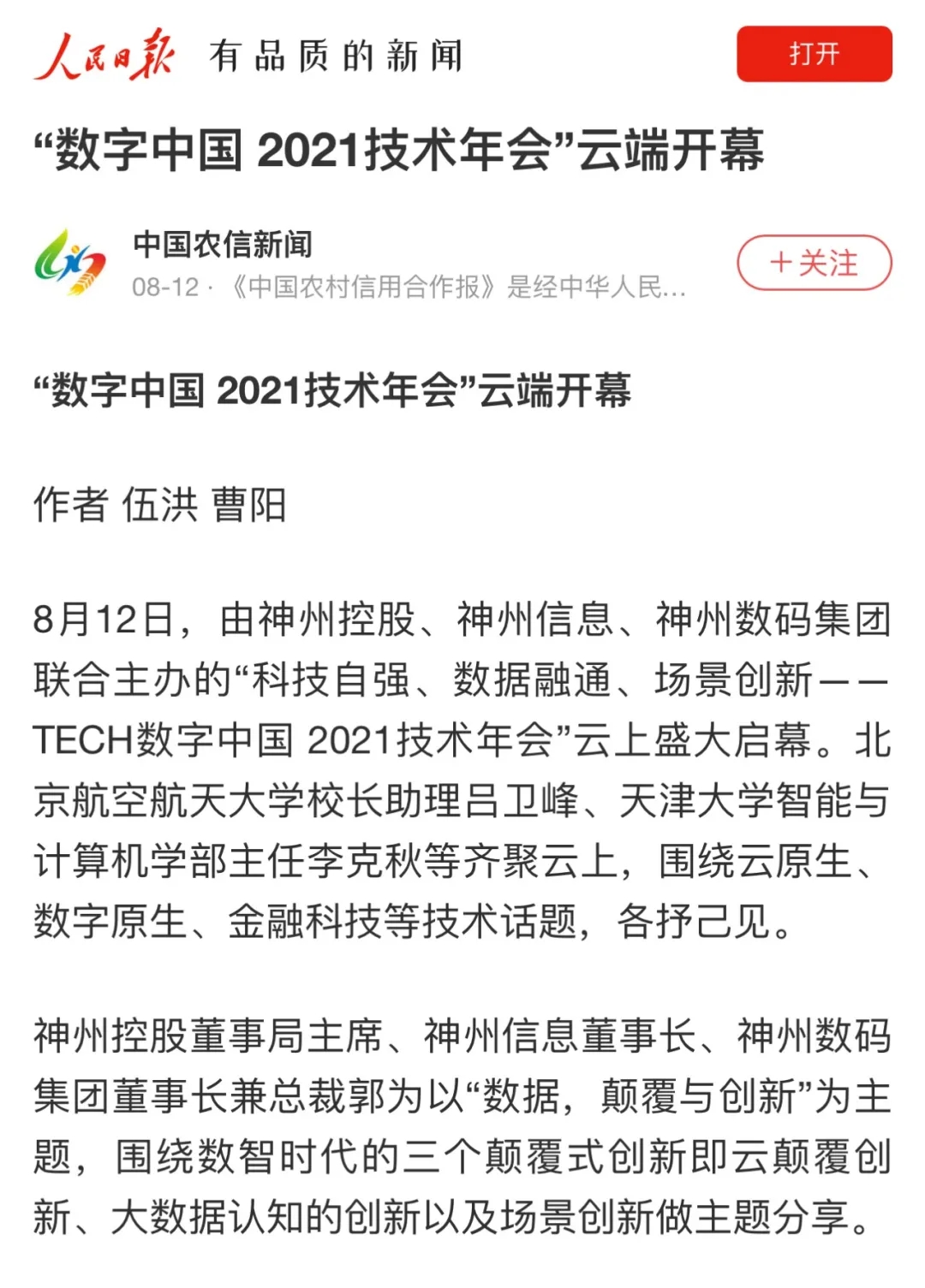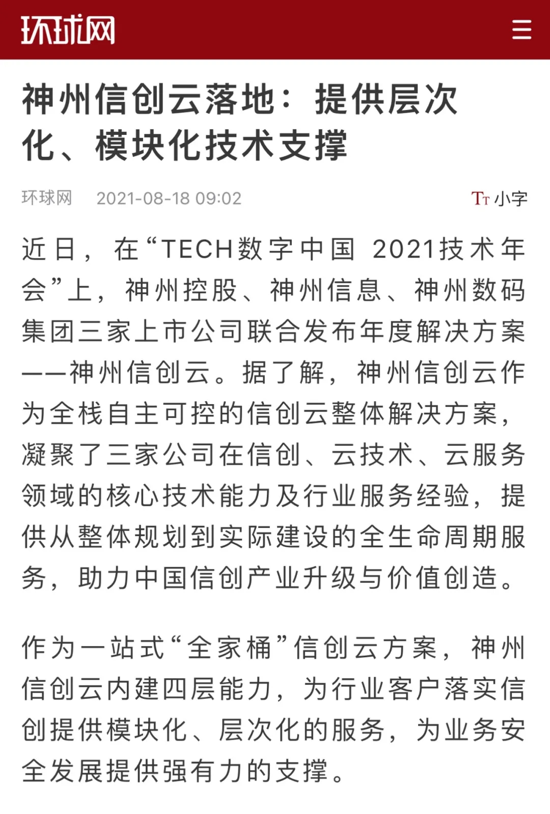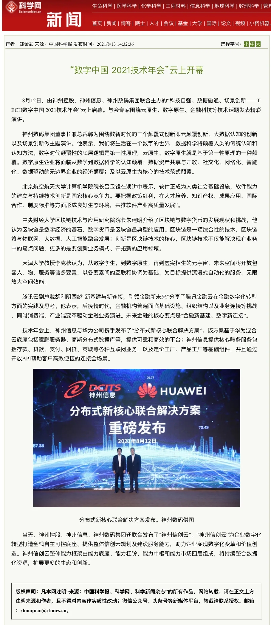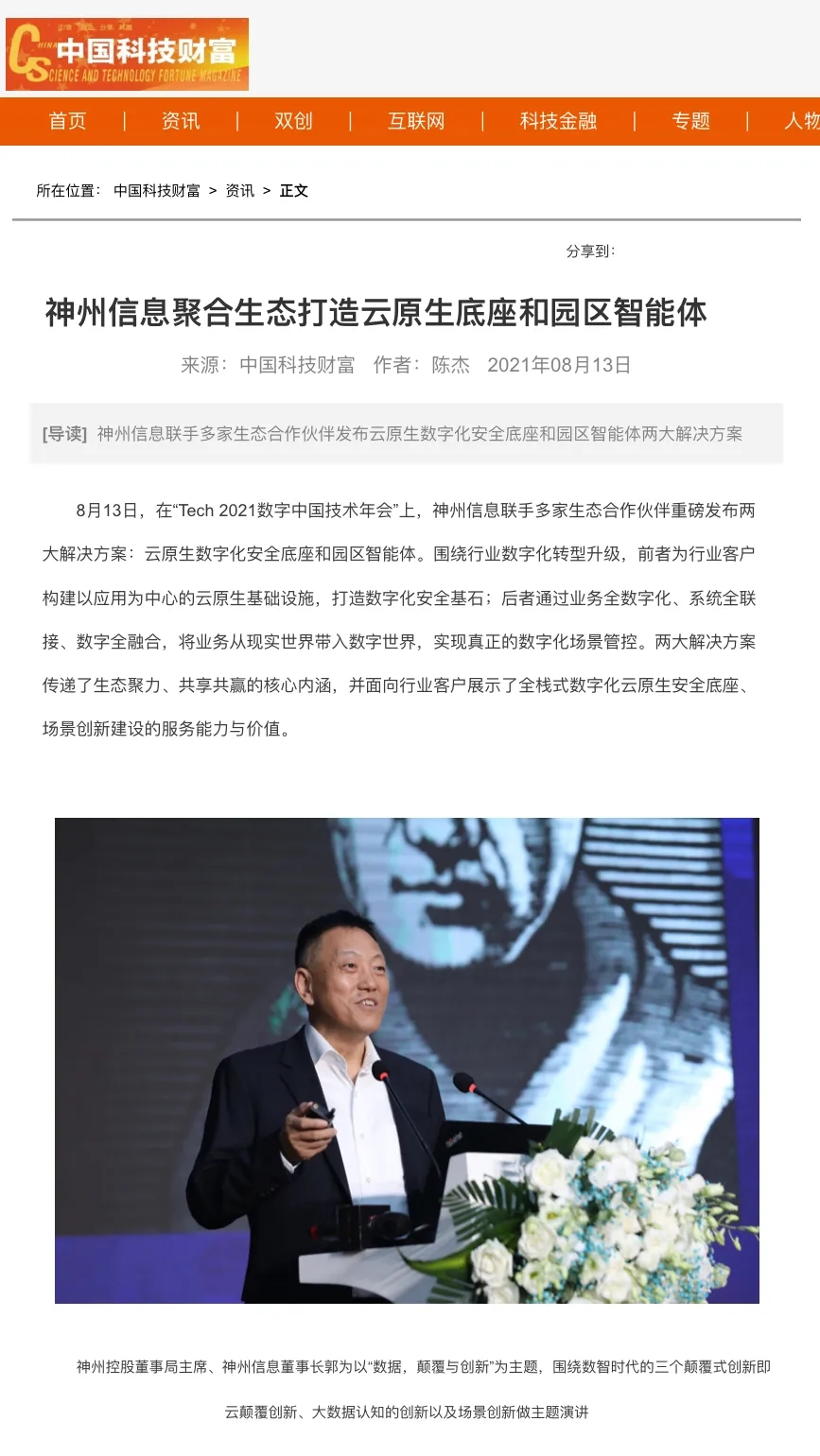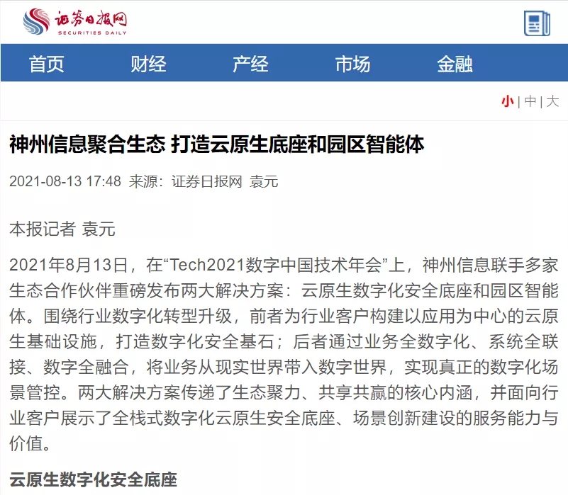 8月12日,由神州控股、神州信息、nangong28.com集团联合主办的“科技自强、数据融通、场景创新——TECH数字中国 2021技术年会”云上盛大启幕,发布神州信创云、ModelB@nk5.0、金融超脑Sm@rtFSB、云原生数字化安全底座、园区智能体等重磅产品,国内各大权威、影响力媒体多角度多频次对盛况进行报道!