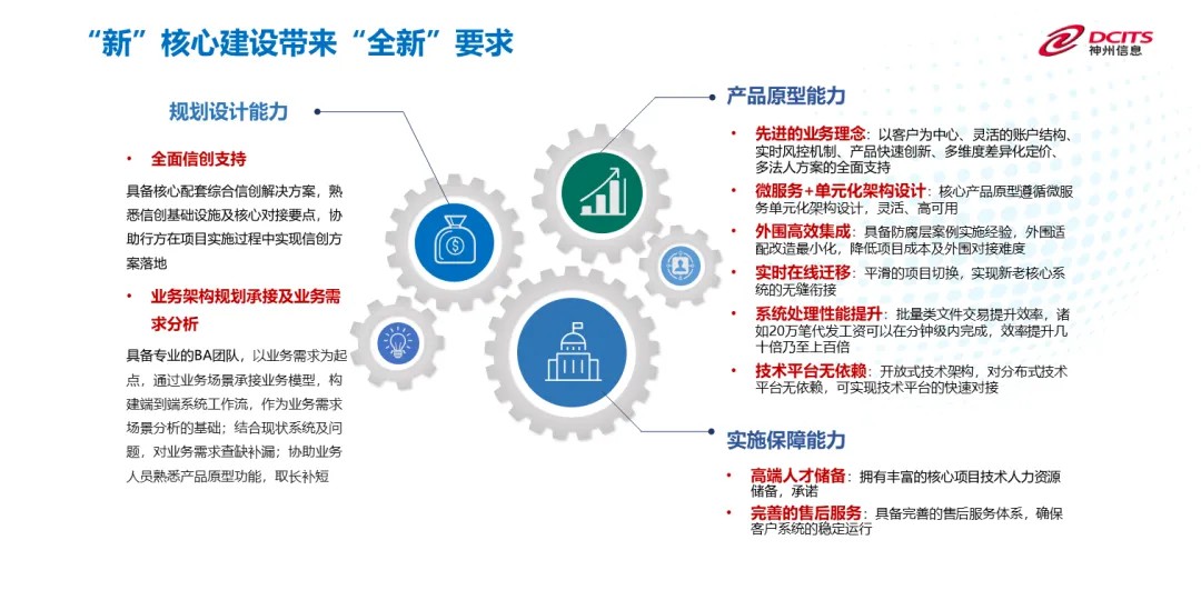 “新”核心建设带来了“全新”要求,赵巍认为,在规划设计能力、产品原型能力和实施保障能力等方面,企业都需要具备相应的人才、资源和素质。神州信息通过大量的实践与技术储备,有能力、有信心帮助金融机构解决相关问题。尤其是在“新核心”的实施过程中,神州信息通过对关键要素的重点把控,有效的帮助金融机构实现焕新发展: